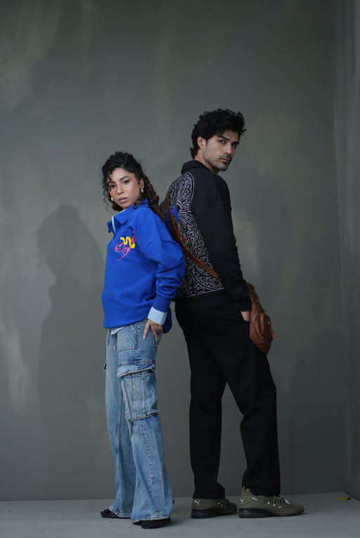 A deep indigo fleece with 70,000+ precision stitches, mixing embroidery and subtle print detailing for rich texture. Relaxed, warm, and made for cooler days — a premium cultural layer with elevated craft and everyday wearability....