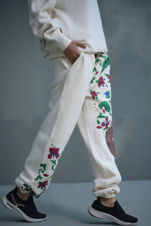 Heavyweight fleece sweatpants built for winter comfort with a relaxed, easy drape. Hand-drawn floral motifs wrap around the leg, paired with leather-texture appliqué patches for depth and character. A standout piece rooted in South Asian craft energy, reworked for urban wear. Soft on the inside, structured on the outside — statement comfort you can move in.