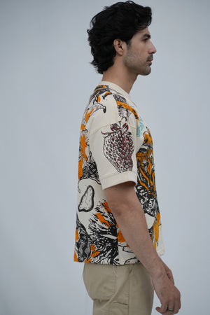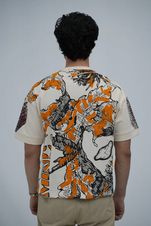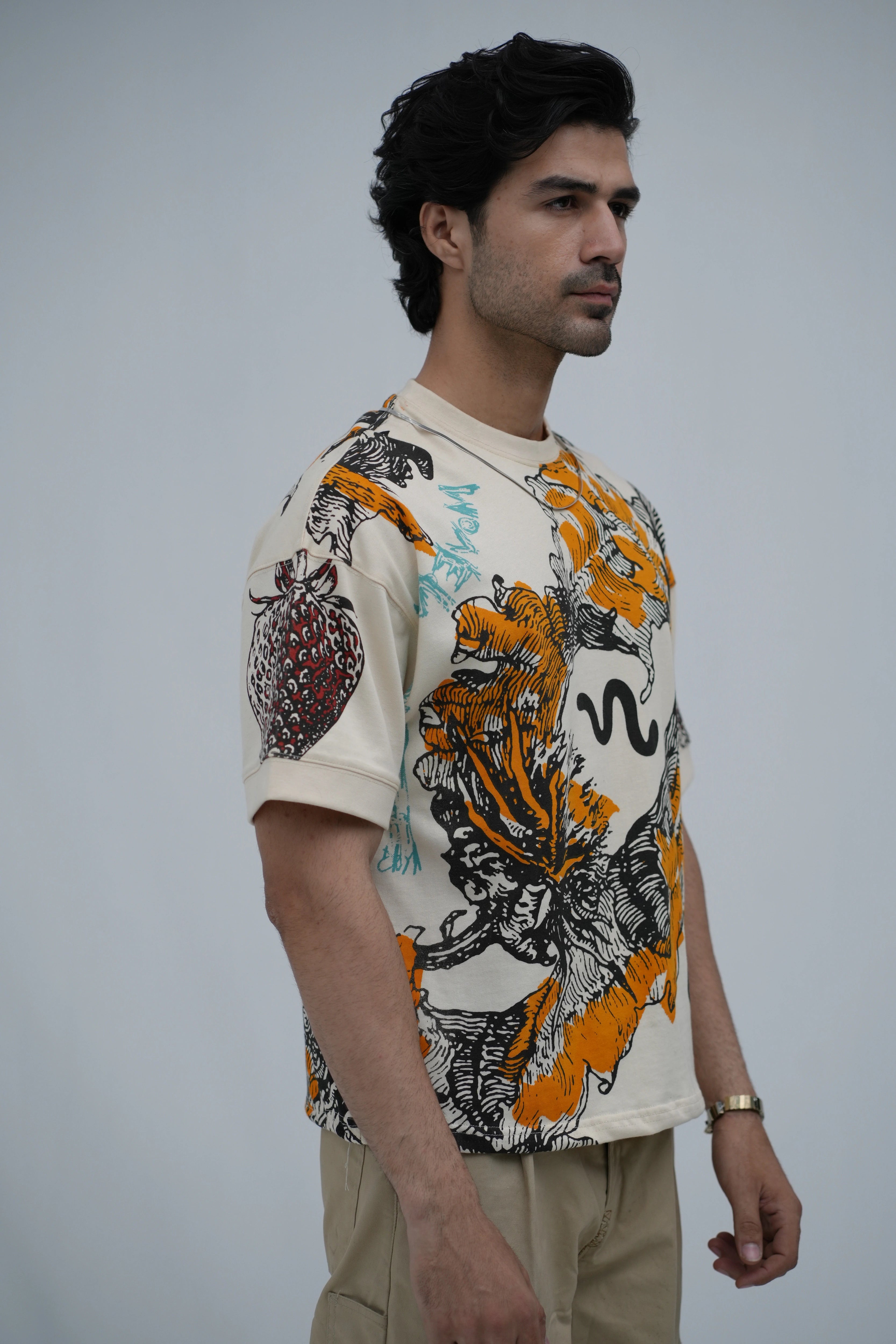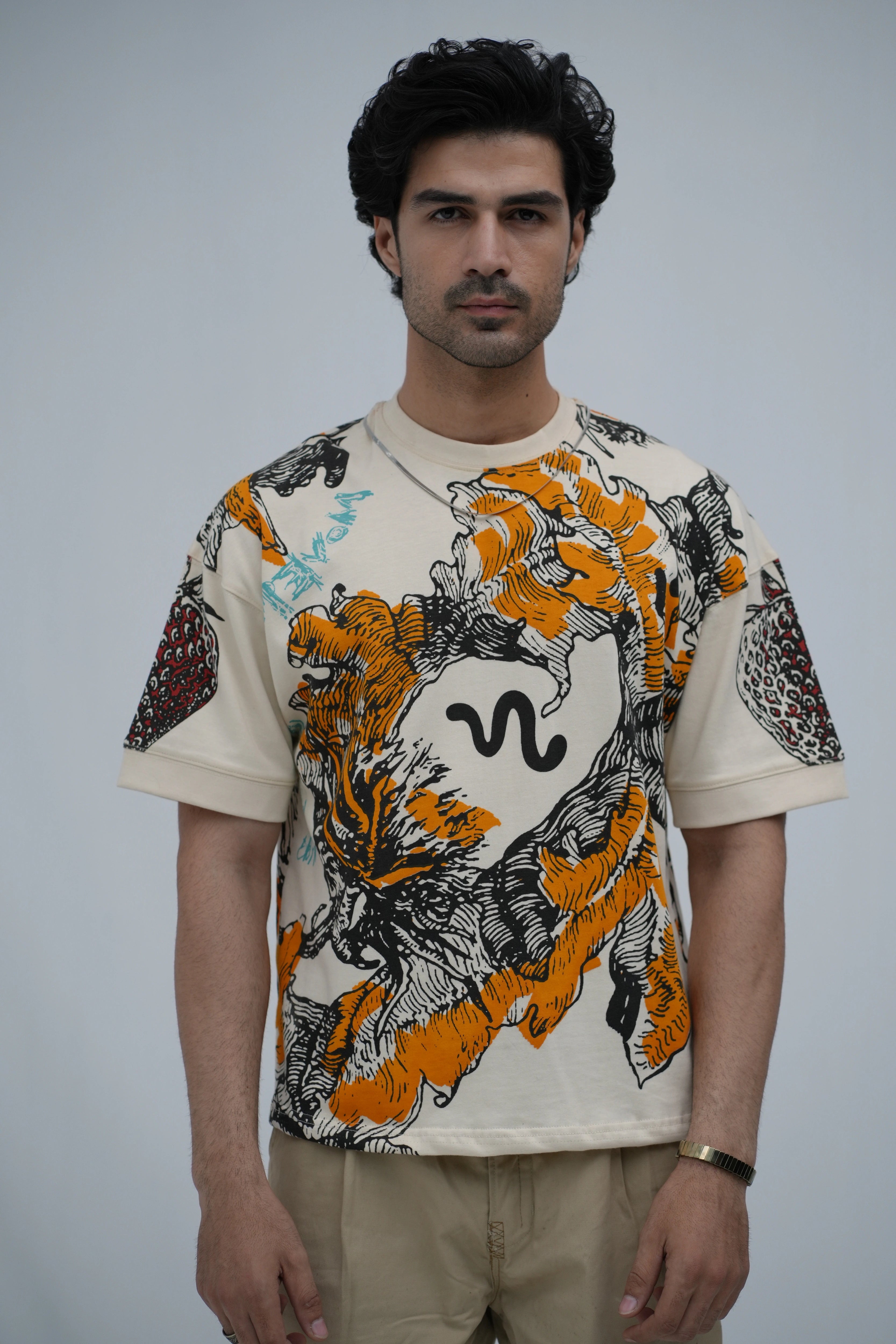 Printed on premium mid-weight cotton, this tee combines bold abstract flame graphics with a clean front mark. Lightweight, comfortable, and ideal for year-round styling — a simple way to add character to everyday fits