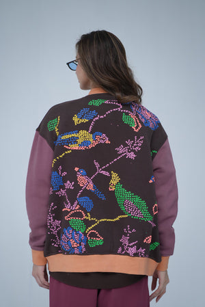 A multi-panel fleece varsity jacket featuring a mix of earthy tones and colorful embroidered mosaic artwork across the back. The chest showcases a textured emblem for subtle branding, while ribbed cuffs and hem offer a sporty finish. With its relaxed fit, soft interior, and standout back detailing, this piece brings warmth and personality into everyday winter layering.