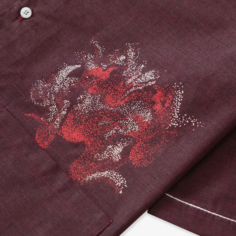 Crafted in a breathable cotton-linen blend, this black half-sleeve shirt features all-over screen and puff printing that echoes the scattered intensity of human emotion. Every mark across the surface feels spontaneous yet intentional—like fragments of thought etched onto fabric. Airy in feel, bold in presence.