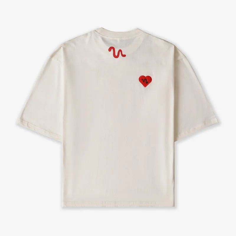 Emotion takes a soft form with this white tee. A small heart made from plush Sherpa fabric is outlined by fine embroidery—creating contrast in texture and tenderness. Minimal yet meaningful, this piece speaks to quiet vulnerability and wearable intimacy.
