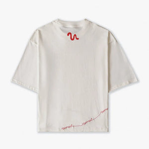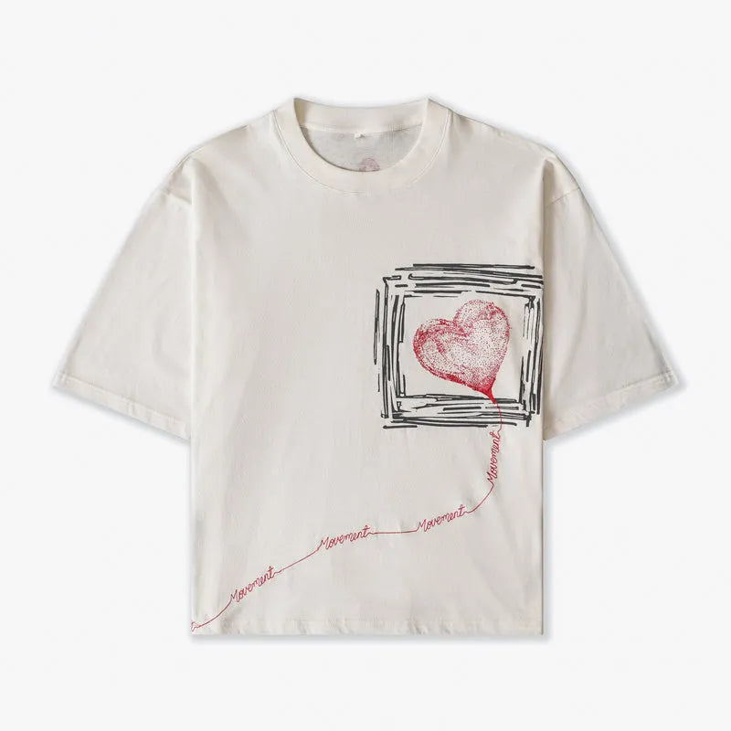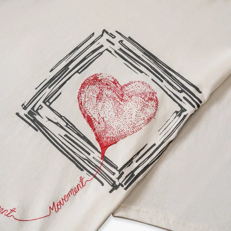 An intricate fusion of texture and technique. This tee features a puff-printed heart bordered by clean screen print. Flowing from the heart is Movement’s signature—stitched in fine embroidery like a trail of emotion unraveling across fabric. A poetic blend of tactile and visual storytelling.